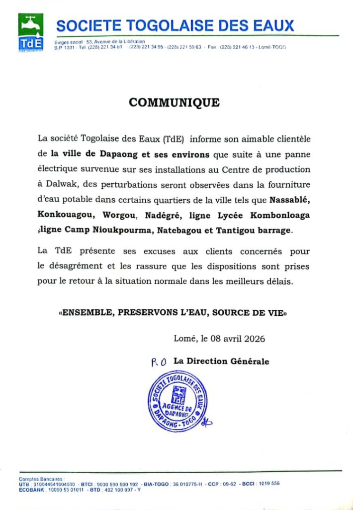 La société Togolaise des Eaux (TdE) informe son aimable clientèle de la ville de Dapaong et ses environs que suite à une panne électrique survenue sur ses installations au Centre de production à Dalwak, des perturbations seront observées dans la fourniture d’eau potable dans certains quartiers de la ville tels que Nassablé, Konkouagou, Worgou, Nadégré, ligne Lycée Kombonloaga et Tantigou barrage.